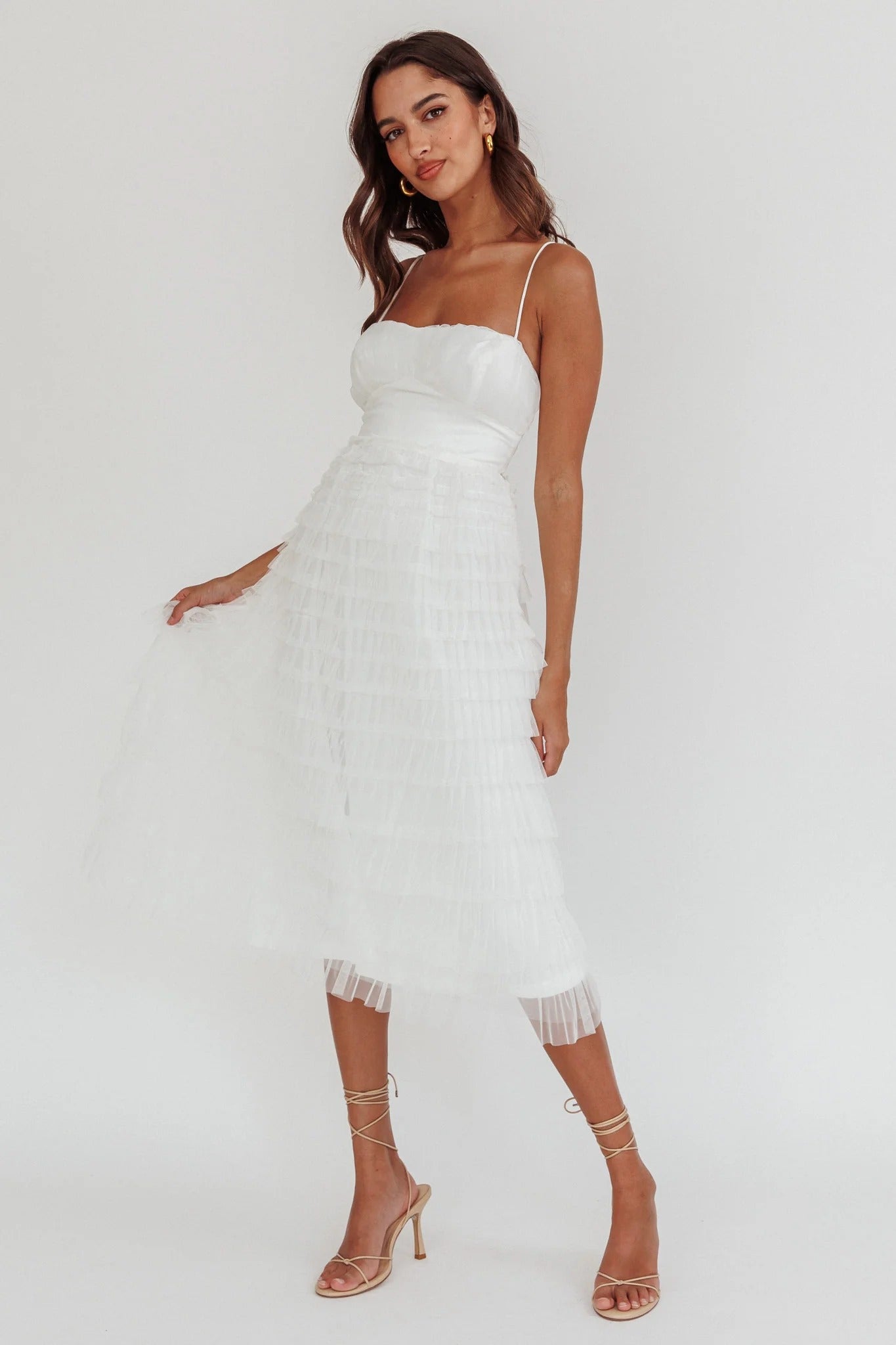 - Drømmeaktig Lagdel – Feminint lagdelt skjørt med sesongens fineste ruffles, skaper en romantisk og elegant silhuett, perfekt for bryllup, gallamiddager eller jubileum.