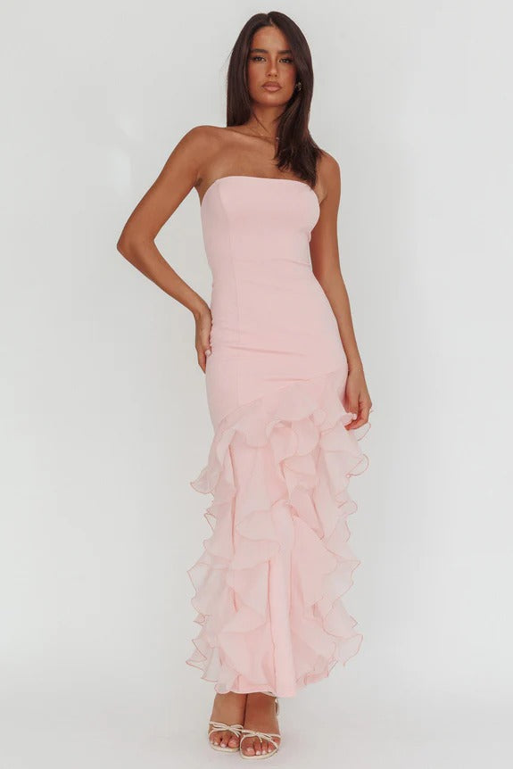 Gå inn i rommet og få alle hoder til å snu. Kioto Maxikjole er skapt for å levere kjefteslående eleganse med uanstrengt letthet. Med stroppeløs utringning, organzavolang og en gulvlengde silhuett forener kjolen tidløs femininitet med moderne sofistikasjon. Perfekt til bursdager, bryllup, gallaer – eller enhver spesiell anledning der du vil bli husket.