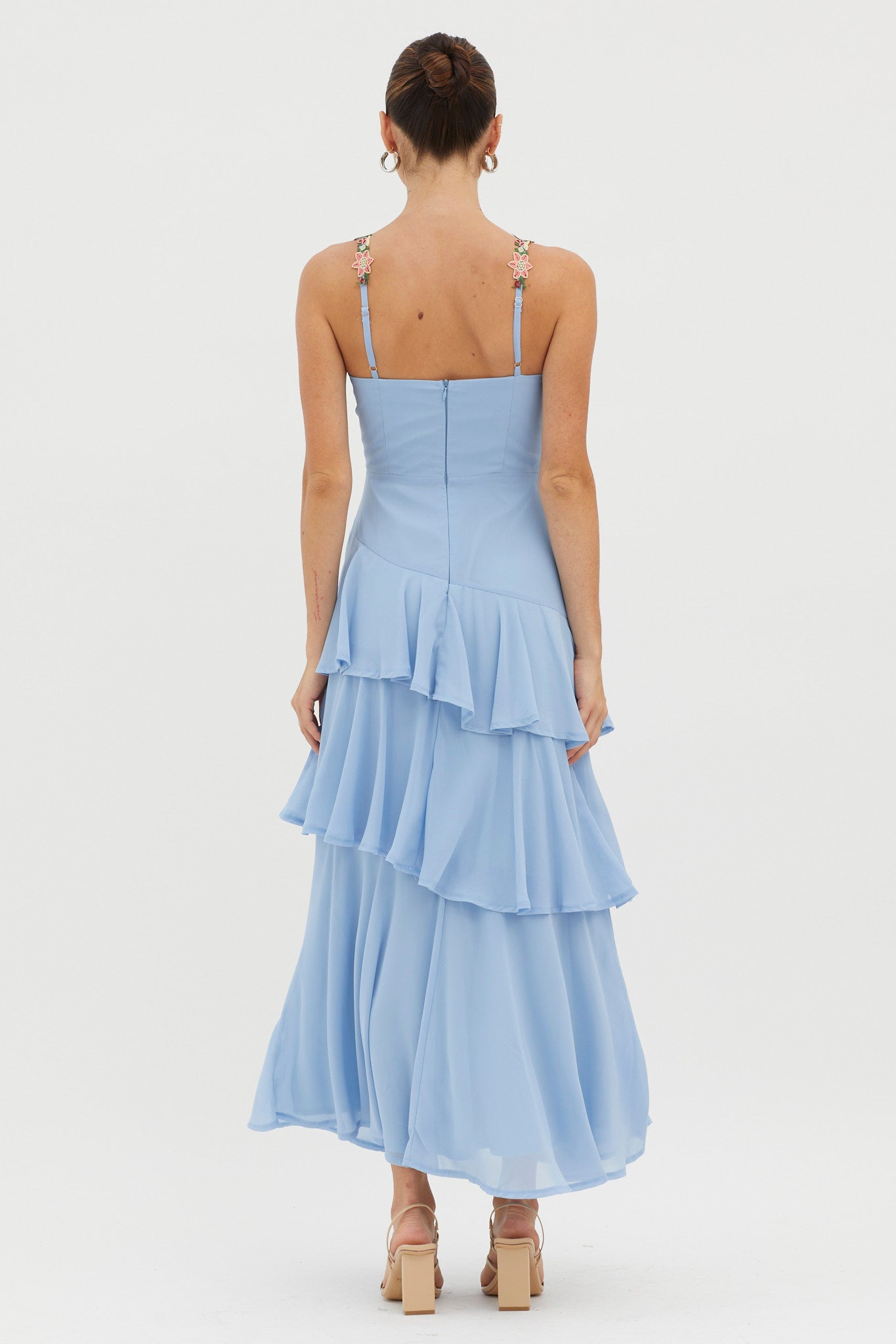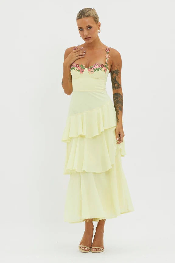 Gjør deg klar til å bli midtpunktet i enhver festlig anledning med vår vakre Rose Garden midi kjole. Denne feminine, blomstrede kjolen er designet for å fremheve din naturlige skjønnhet med feminint tiered ruffle-detaljer og blomsterappliqué som pynter hele plagget. Den polstrede busten og justerbare stropper gir perfekt passform og støtte, mens den elegante, linede konstruksjonen sørger for komfort hele kvelden. Enten det er bryllup, romantisk date eller sommerfest, vil denne kjolen gi deg en drømmeaktig og sofistikert look.